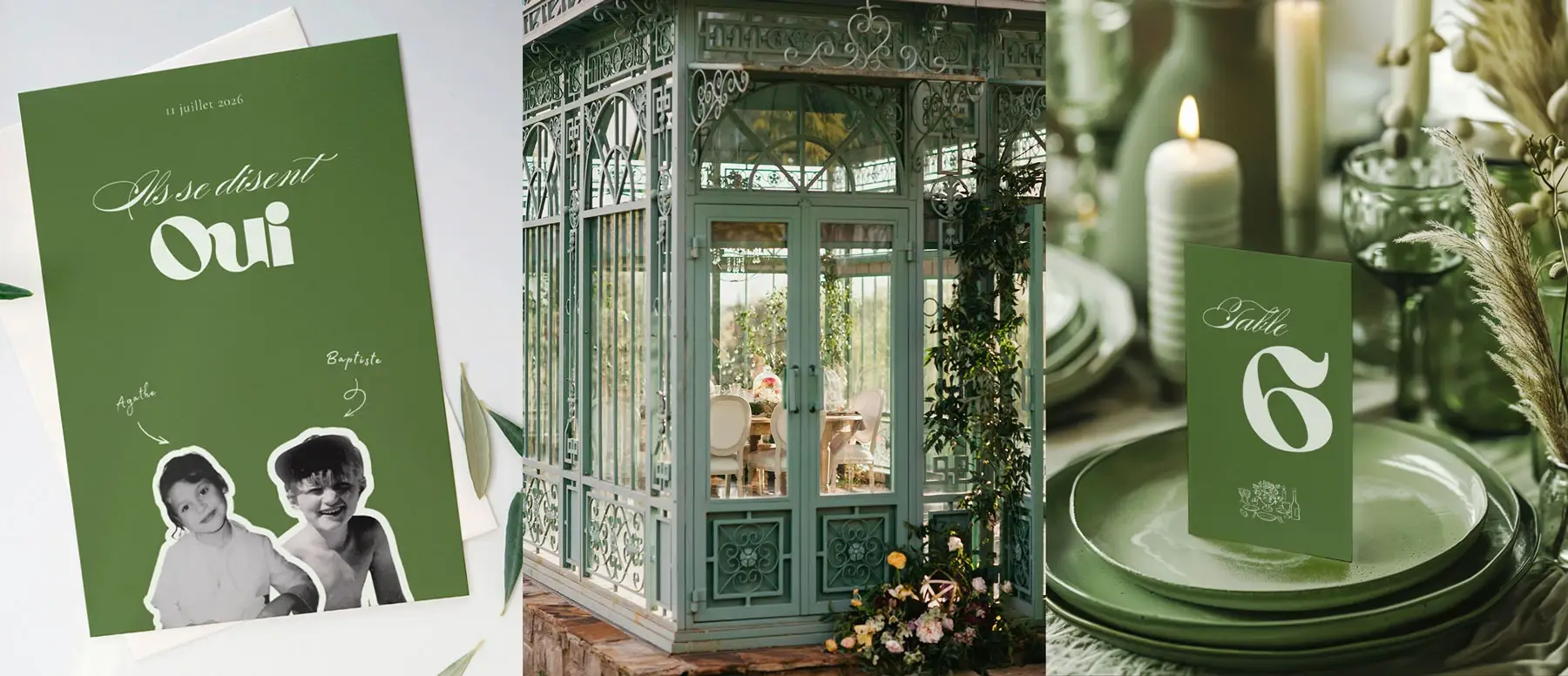 Faire-part de mariage uni vert avec illustration à la main du lieu de mariage, design élégant et personnalisé.