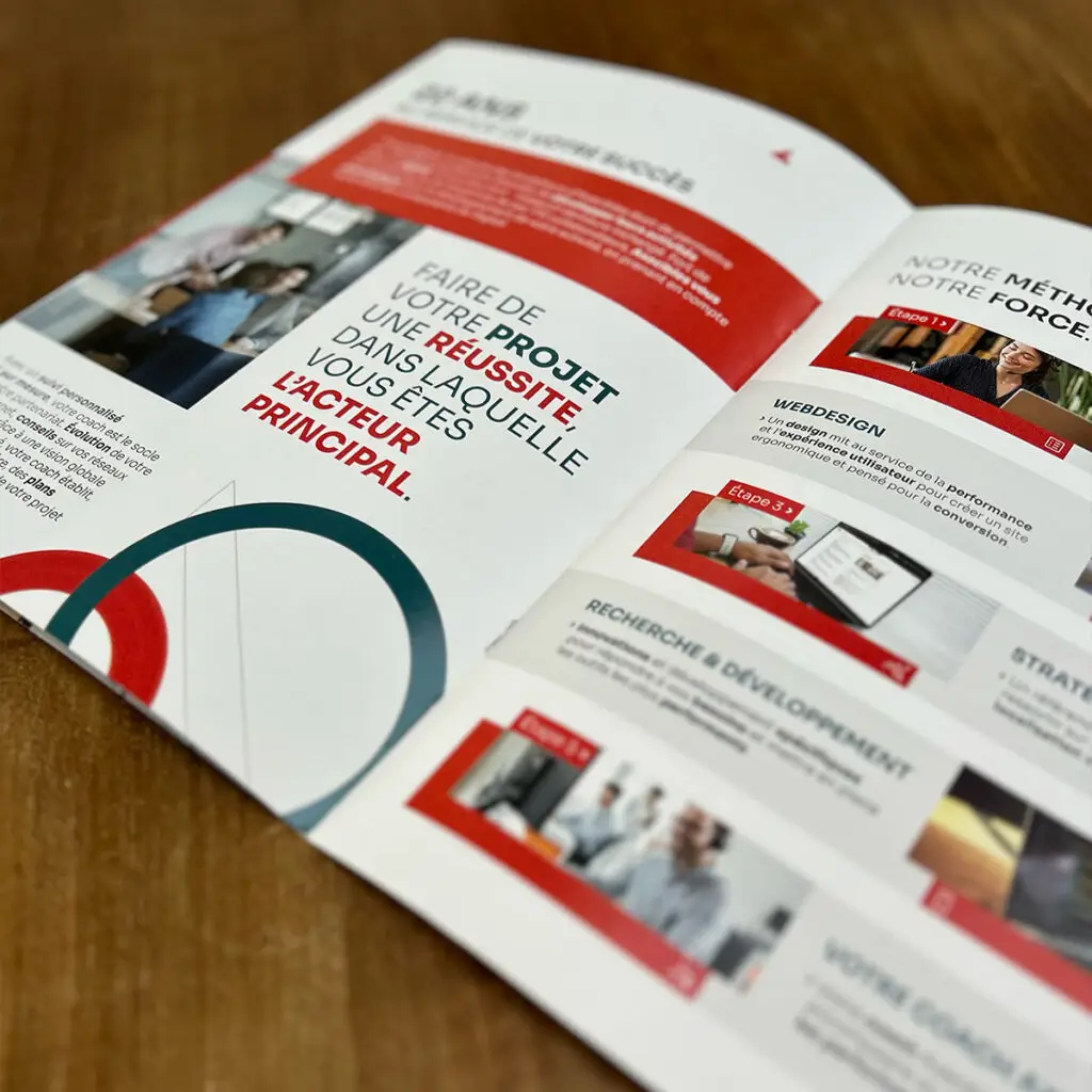 Les finitions subliment le tout : pelliculage soft-touch pour un toucher velouté, vernis sélectif 3D pour faire ressortir certains éléments graphiques, ou encore dorure à chaud pour une note de prestige. Chaque détail compte pour faire de votre brochure un support à votre image : durable, élégant et efficace.